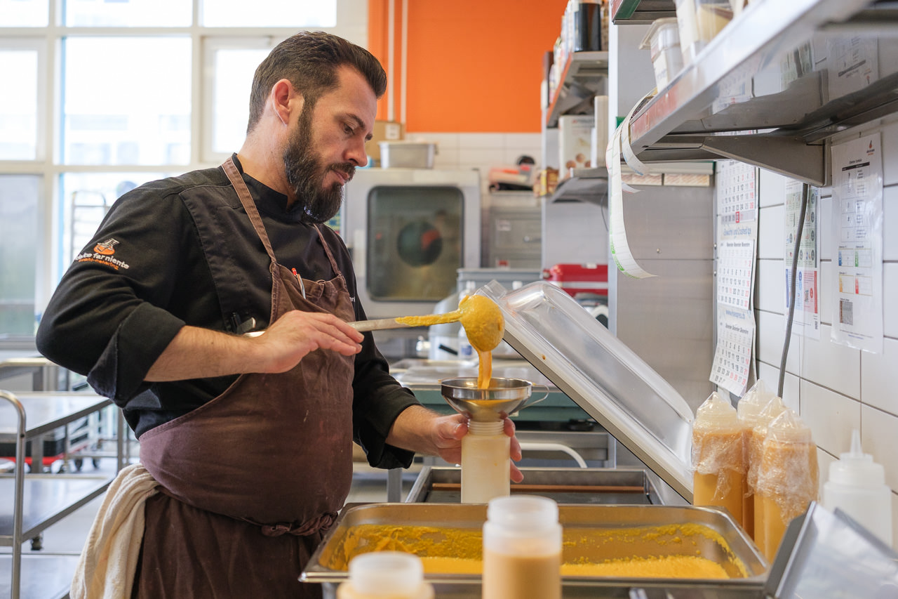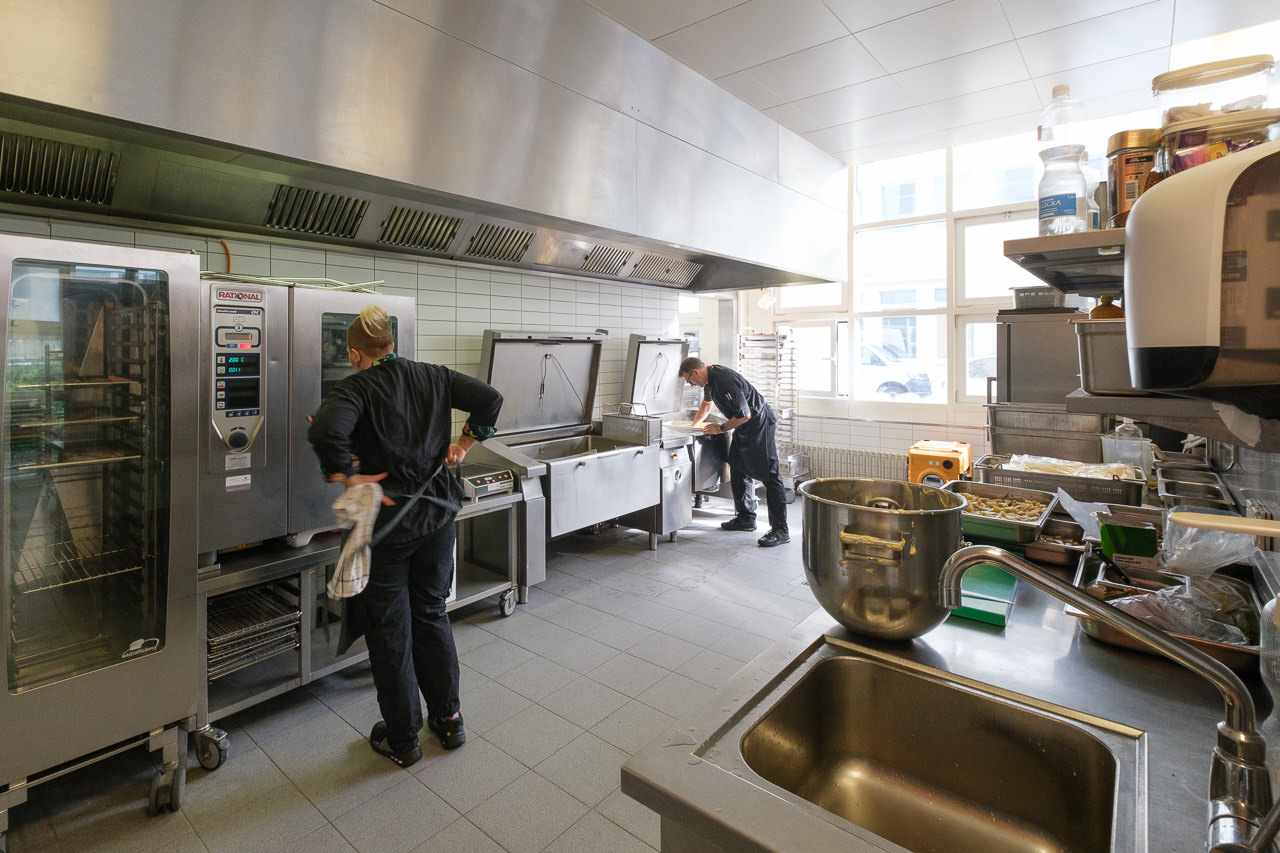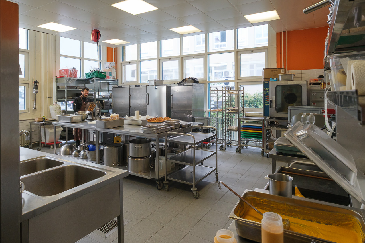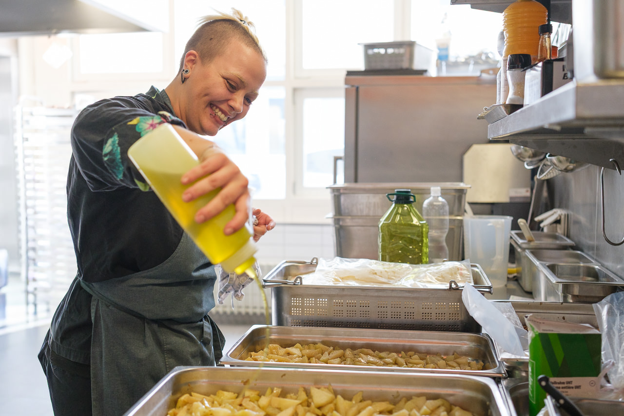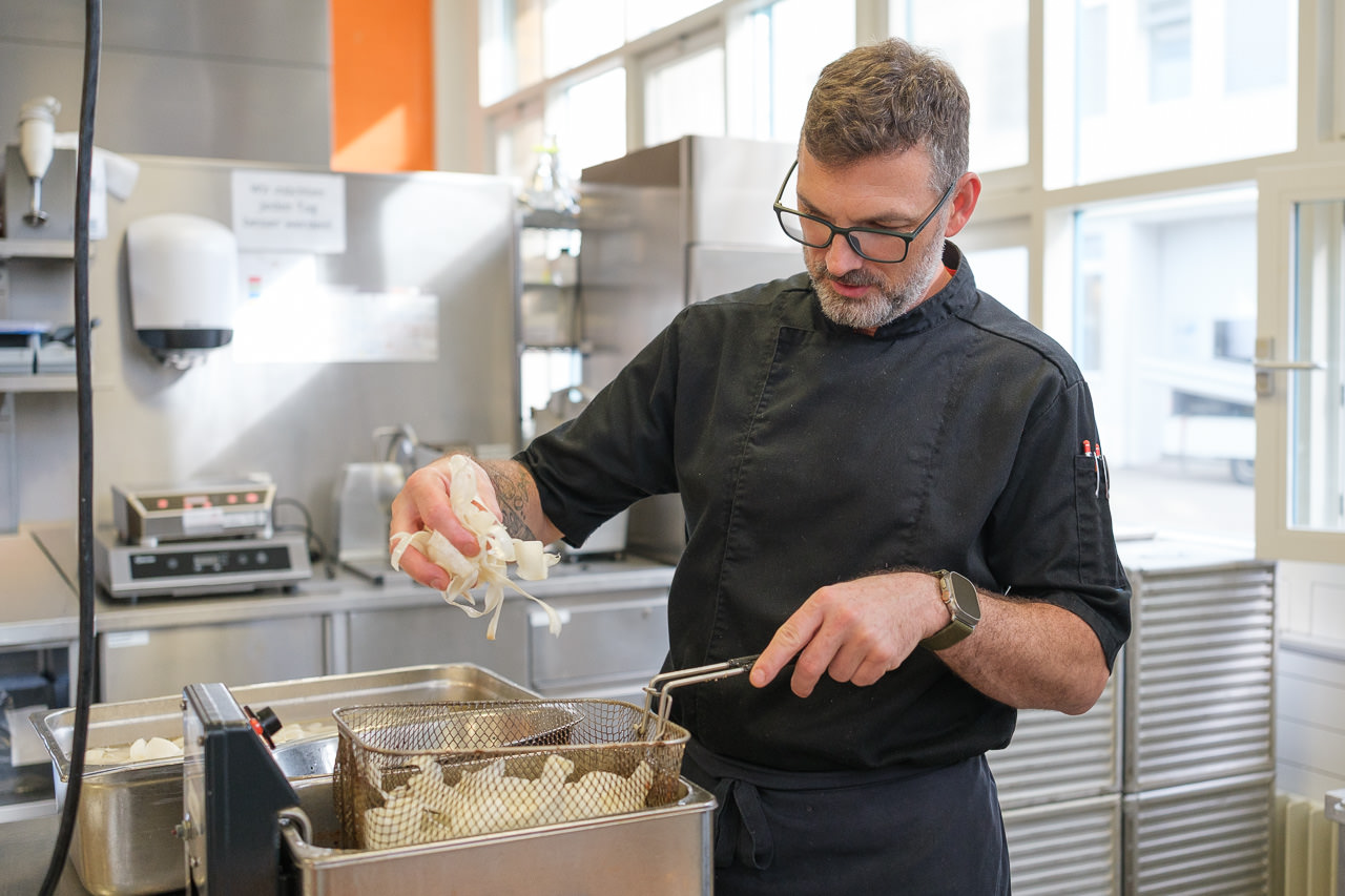 Beim Rundgang durch die Räumlichkeiten erhalten wir einen lebendigen Eindruck davon, wie hier gearbeitet wird: das offene Büro für die Projektkoordination, die offene Küche für die sorgfältige Zubereitung der Speisen. Zwischen dampfenden Pfannen, frischen Zutaten und konzentrierten Handgriffen wird klar, wie viel Präzision und Freude hinter jedem Menü stehen. Hier entsteht Genuss mit echter Hingabe.
